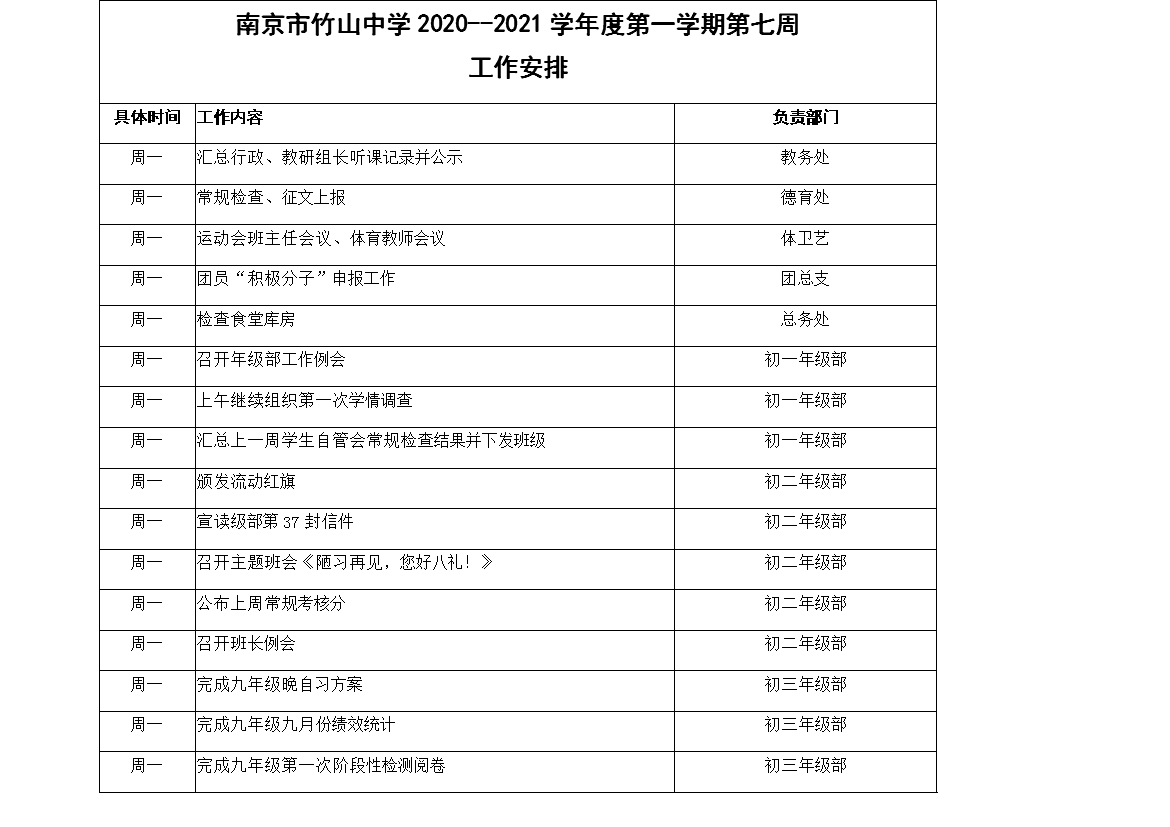 南京市竹山中学2020--2021学年度第一学期第七周工作安排